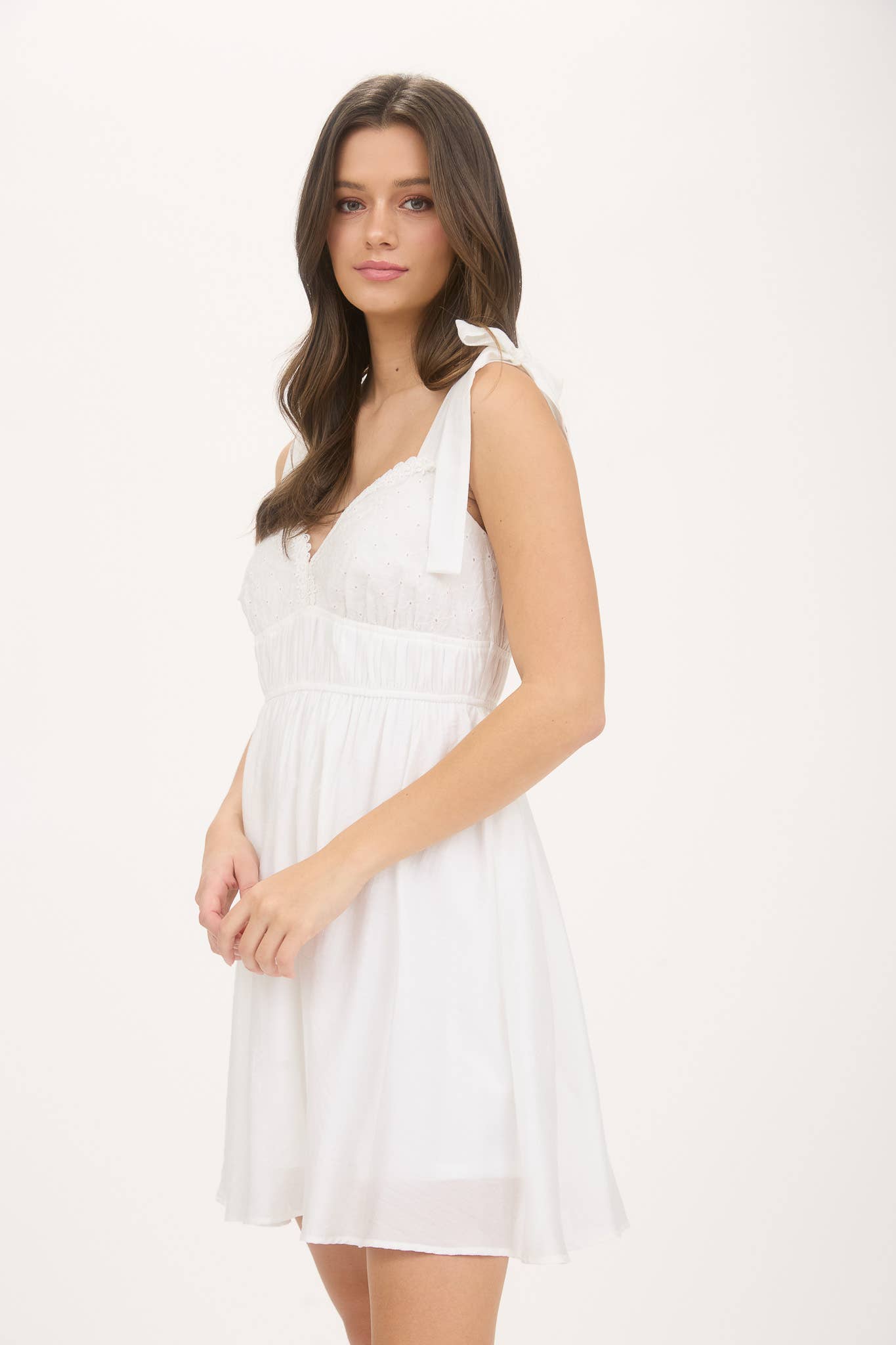 Romantic and sun-ready, this Eyelet Detail Mini Dress is made for dreamy days and warm nights. Featuring a flattering sweetheart neckline and adjustable tie straps, this sleeveless silhouette is all about delicate details. The eyelet accents at the bust and lace trim throughout bring a vintage-inspired charm, while the shirred waist adds shape and comfort.