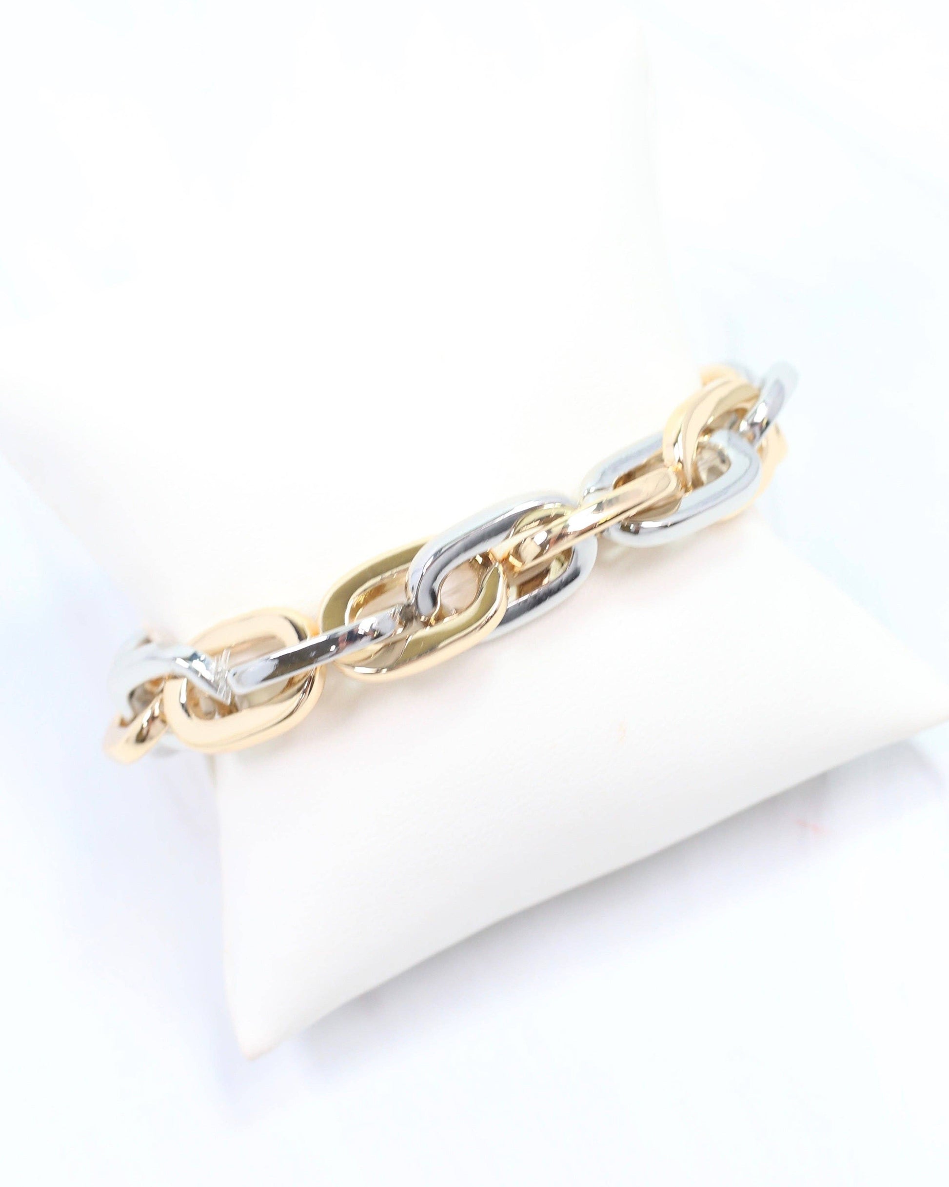 Elevate your accessory game with the Josie Link Stretch Bracelet, featuring elegant interlocking gold and silver links. Its unique two-tone design offers unmatched versatility, effortlessly complementing any outfit. The stretch fit ensures all-day comfort without compromising style.