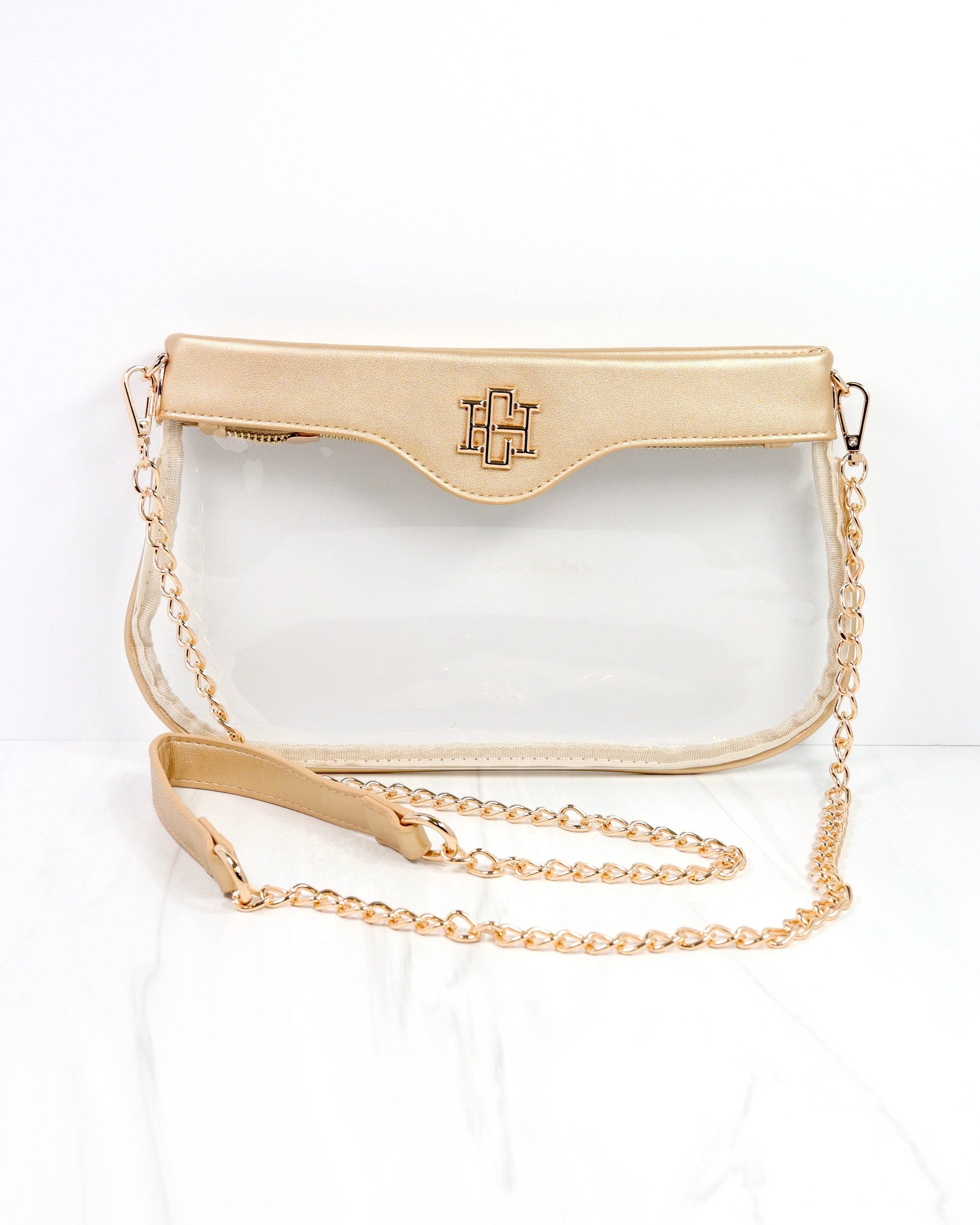 The Madi Clear Crossbody in Gold is the perfect accessory for game day, combining style and practicality. Its transparent design meets stadium requirements, while the chic chain strap adds a fashionable touch. Easily pair it with our purse chains, nylon strap, or Molly Card Holder to customize your look and keep essentials close at hand.