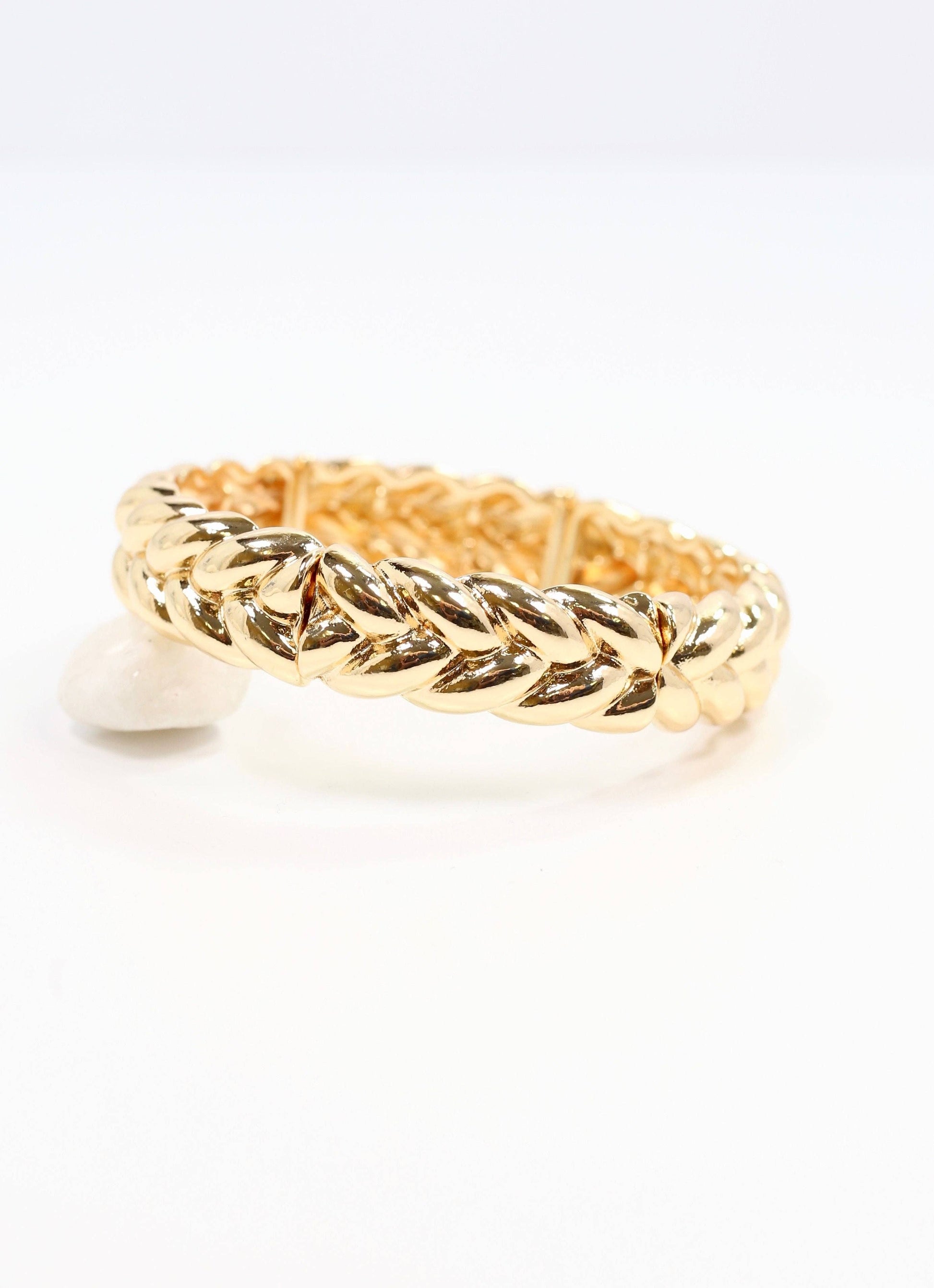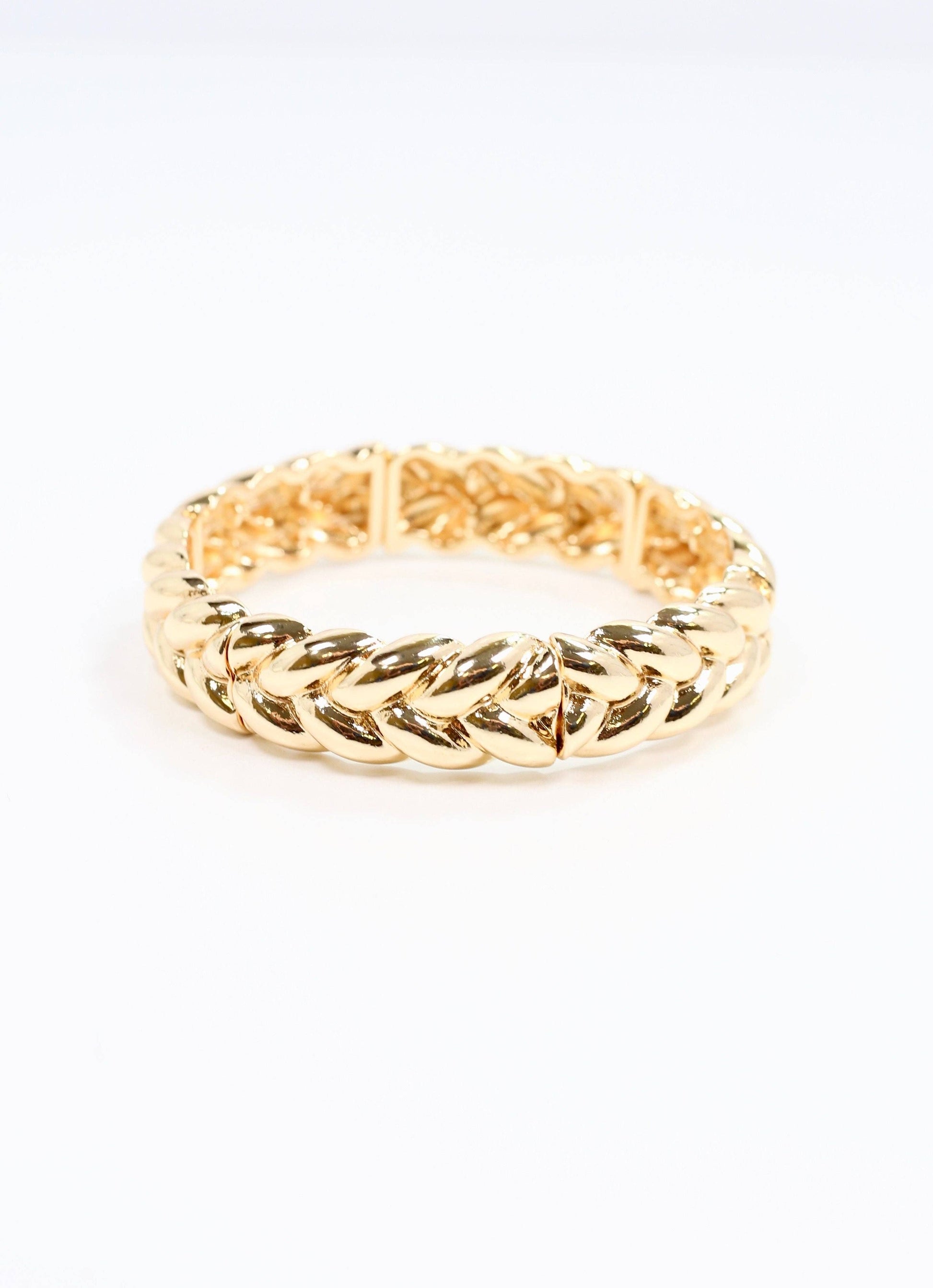 This shiny stretch bracelet has a braided metal design that pairs easily with any outfit, casual or elegant.