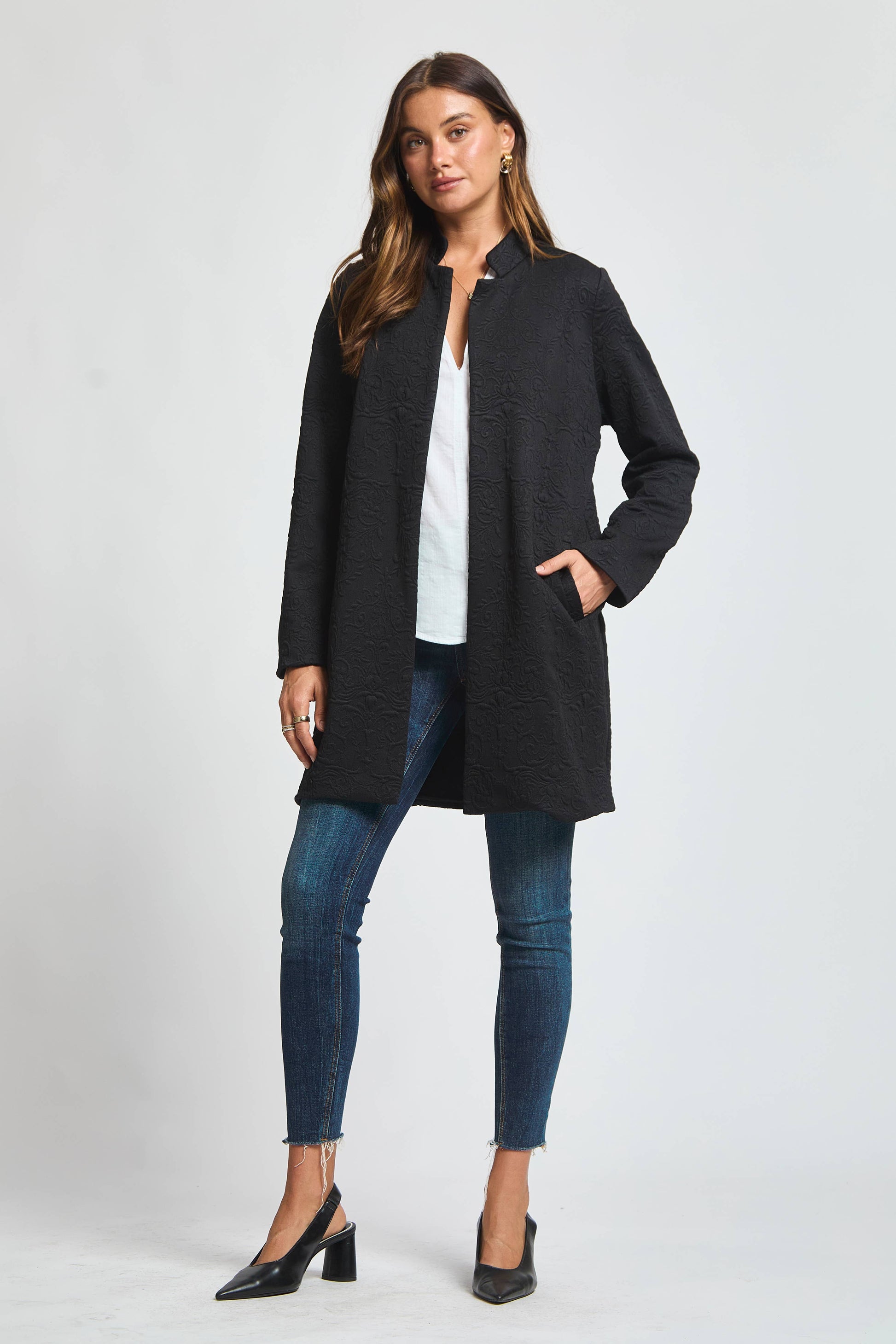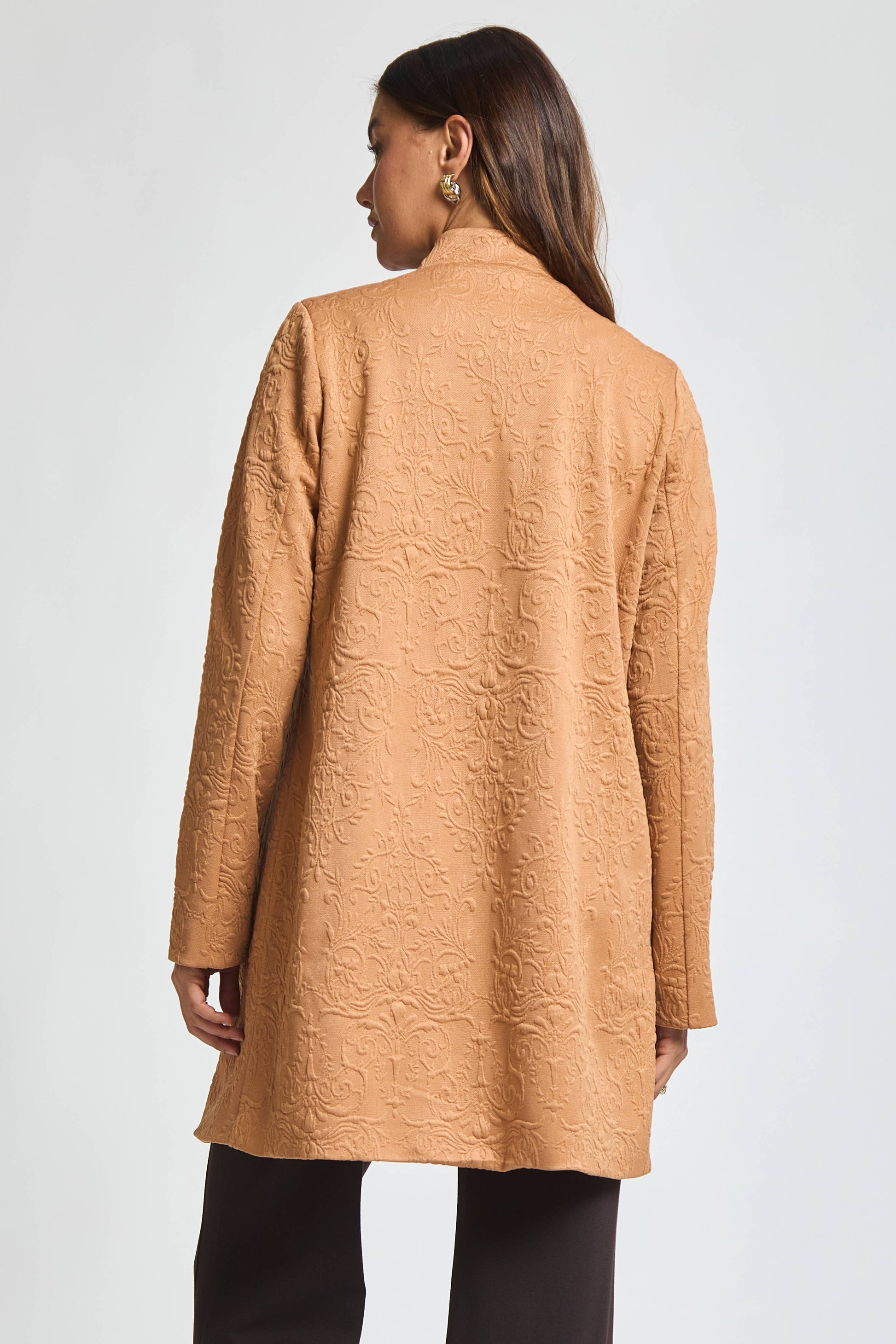 Make a statement in this elegant jacquard midi coat, where intricate texture meets timeless design.