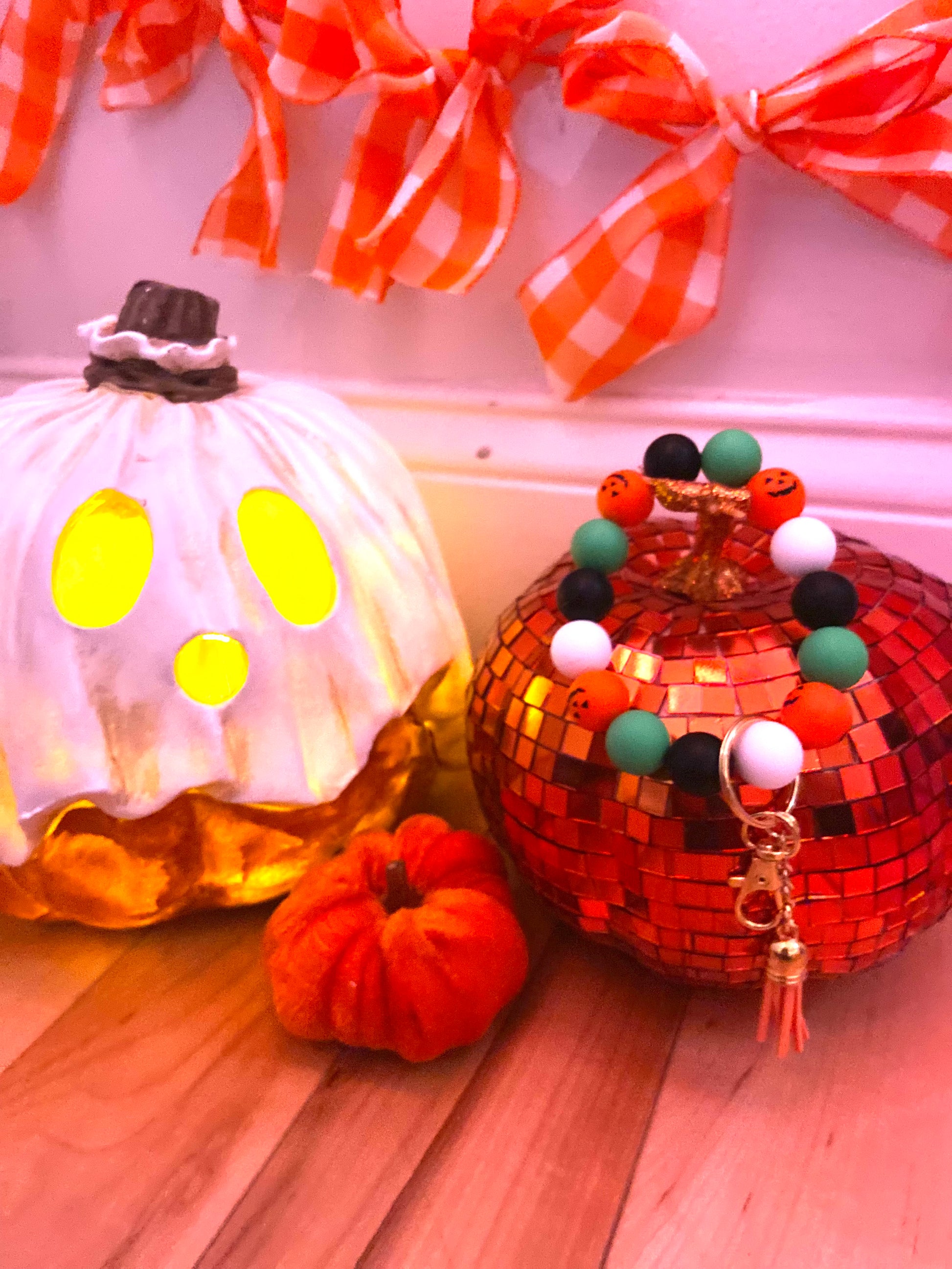 The keychain is finished with a bead strand in a classic Halloween colorway: white, black, green, and orange, making it the perfect seasonal accent for your keys, bag, or even a gift for your favorite Halloween enthusiast.