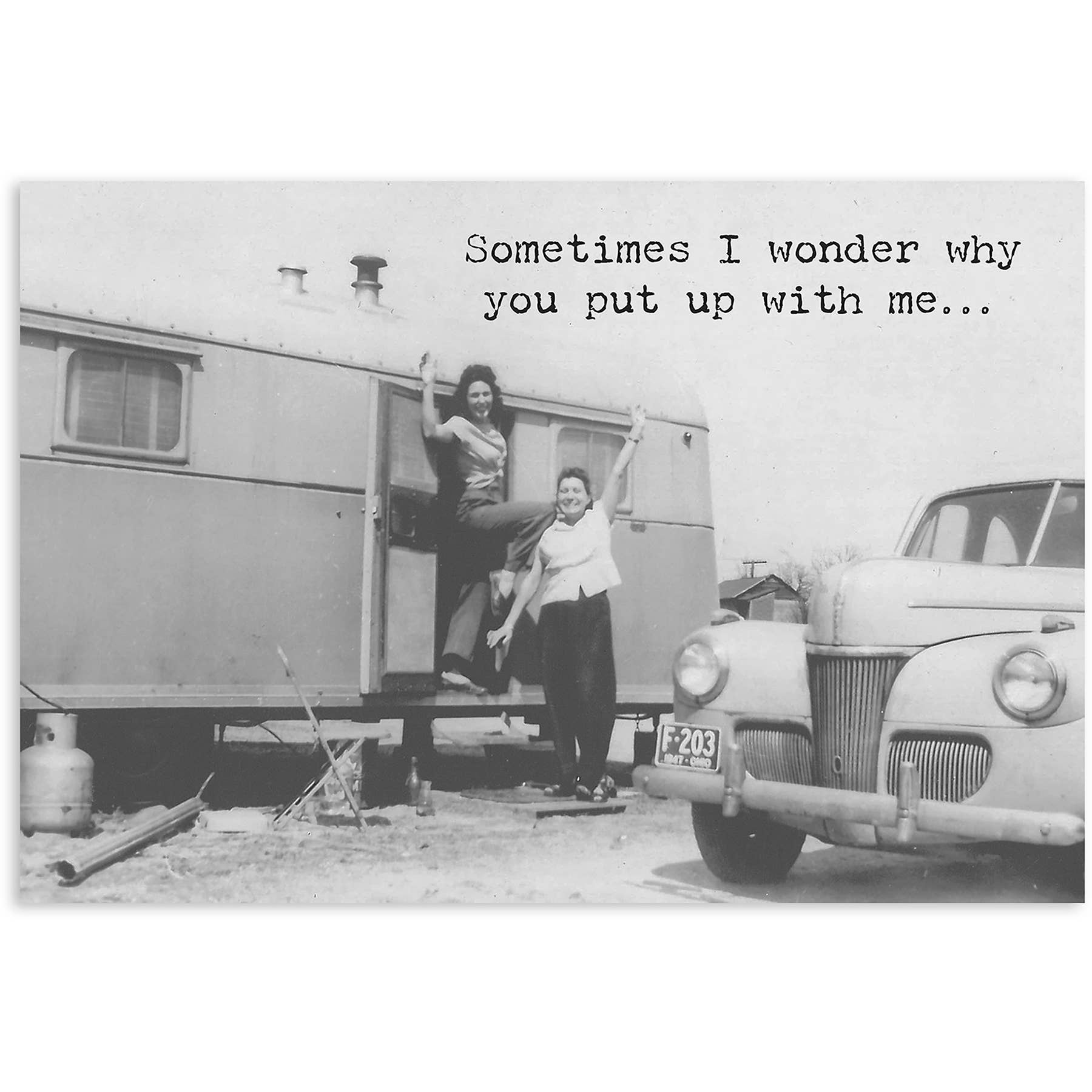A humorous greeting card featuring vintage photography with outside "Sometimes I Wonder Why You Put Up With Me..." and inside "Then I Remember That I Put Up With You. So We're Even." sentiments.