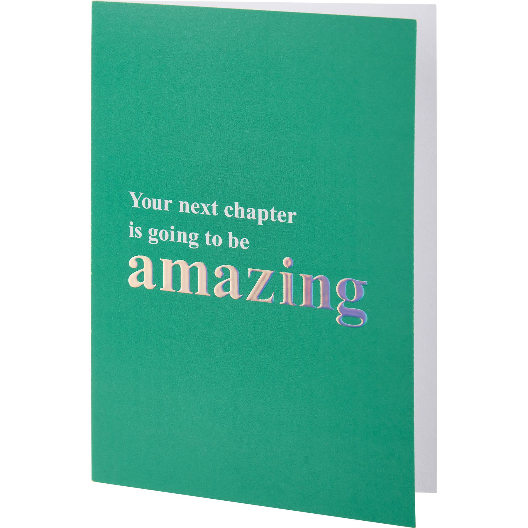 An inspirational greeting card from our Greeting Card Collection displaying a sentiment with digitally embossed and holographic foil accents that creates a shimmering texture you can feel. The front of the card features "Your Next Chapter Is Going To Be Amazing" sentiment with a blank space inside to create a personalized message. Each card includes a brown kraft paper envelope for the perfect finishing touch. Your Next Chapter greeting card is proudly made in the USA.