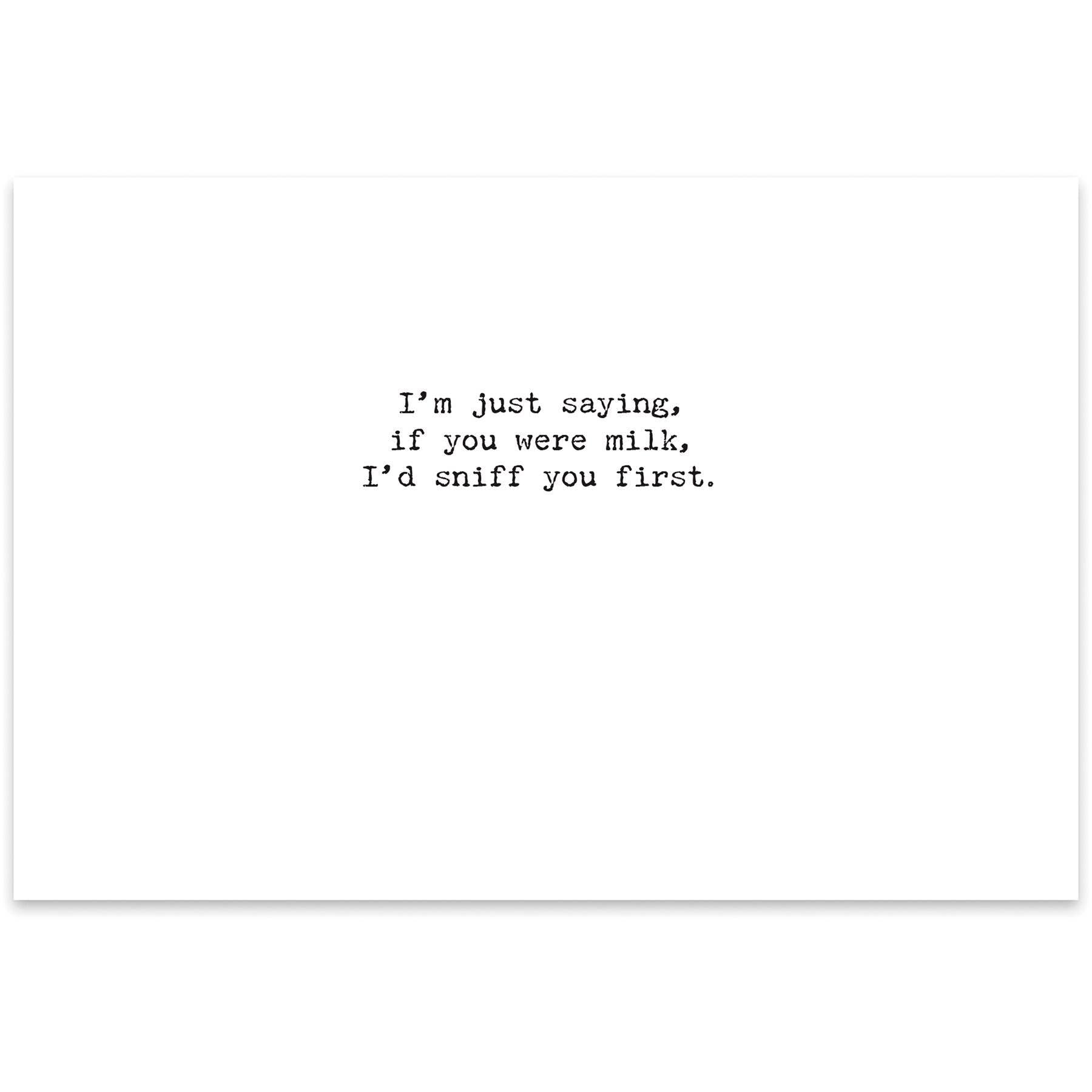 A humorous greeting card featuring vintage photography with outside "Look, I'm Not Saying You're Old..." and inside "I'm Just Saying If You Were Milk I'd Sniff You First." sentiments. Made in the USA.