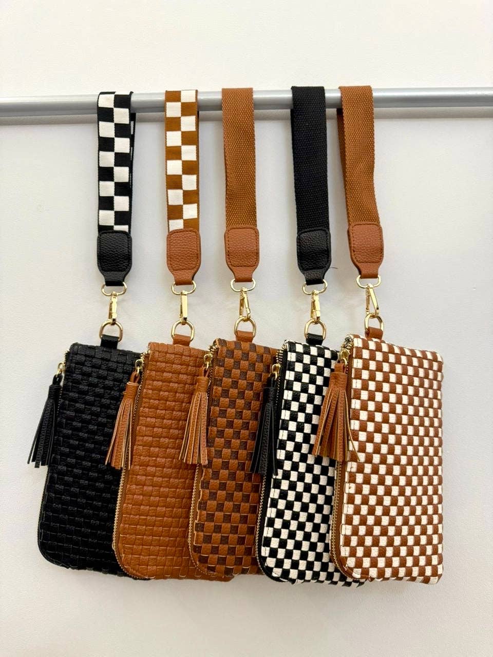 Paired with a coordinating tan-and-white checkered wrist strap, it echoes the effortless charm of the Willa Woven Crossbody – Tan while offering easy, on-the-go style.